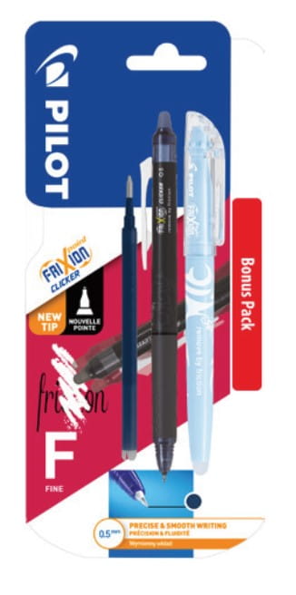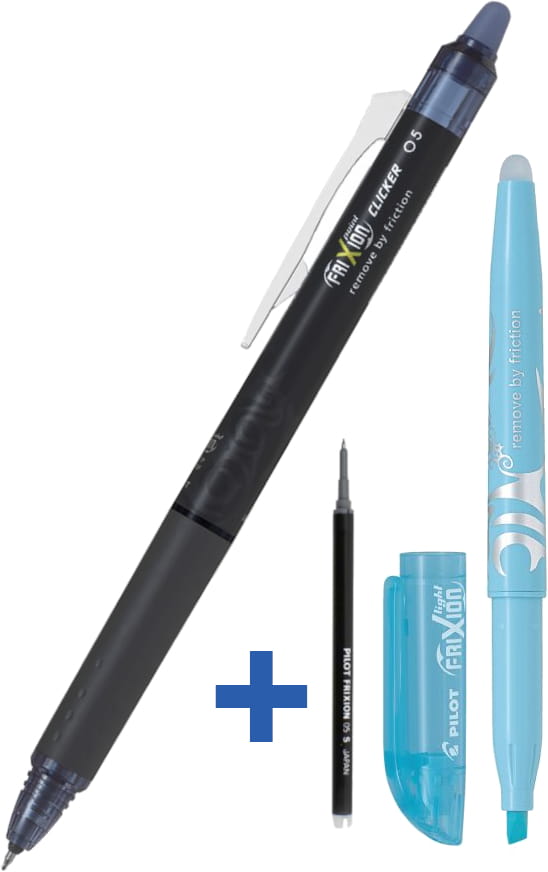 Ten zestaw zawiera Długopis Frixion Clicker 0,5 oraz dodatkowy wkład Frixion 0,5 w kolorze granatowym i zakreślacz wymazywalny Frixion Pilot. Dzięki specjalnemu tuszowi termozmazywalnemu, możesz pisać, rysować i korygować swoje notatki. Po prostu zetrzyj napisaną linię gumką na końcu długopisu, a tusz zniknie magicznie.