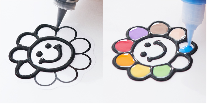 Zrób kontur linerem według wzoru (własnego lub z zestawu), a następnie farbami wypełnij wolne przestrzenie między konturami.