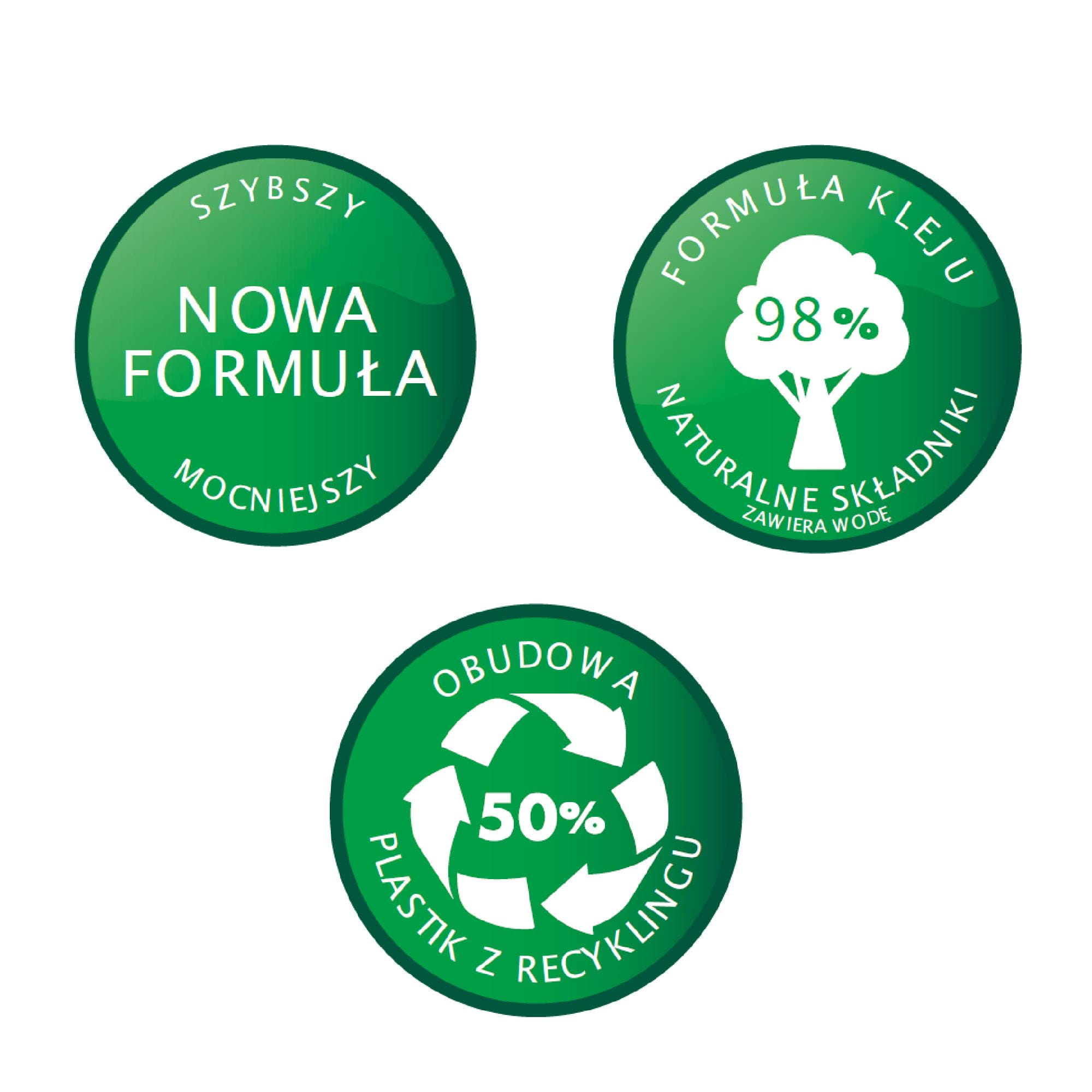 Formuła kleju składa się w 98% z naturalnych składników (w tym wody) i nie zawiera rozpuszczalników.