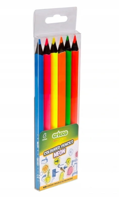 miękkie w temperowaniu i w odróżnieniu od zwykłych, nie kruszą się i nie pylą. Kredki idealnie nadadzą się do zestawu małego artysty lub znajdą swoje miejsce w szkolnym plecaku. Zestaw składa się z 6 różnych kolorów kredek w odcieniach neonowych w wygodnym etui.