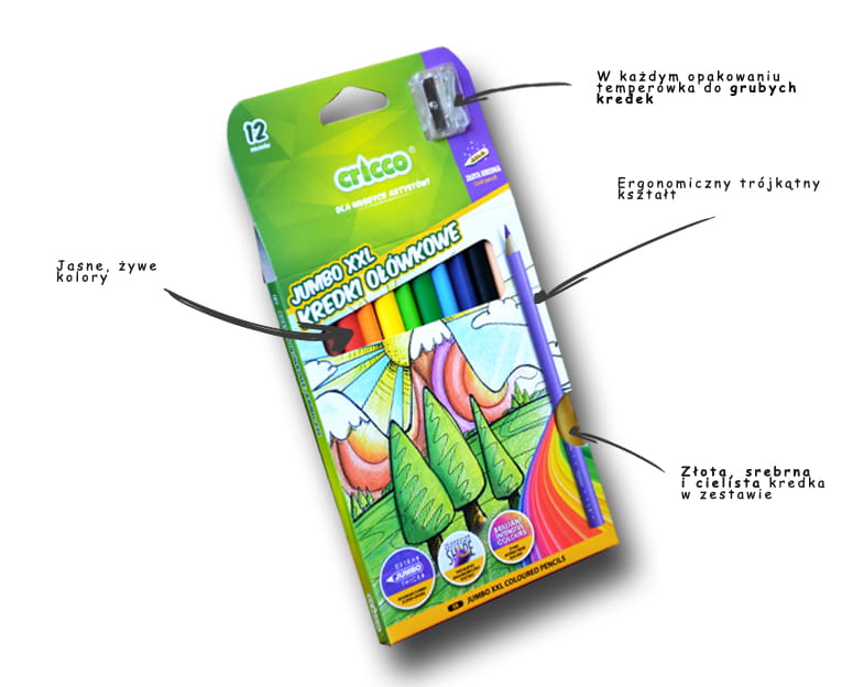 Kredki Ołówkowe Trójkątne Grube XXL Cricco 12 Kolorów + Temperówka
