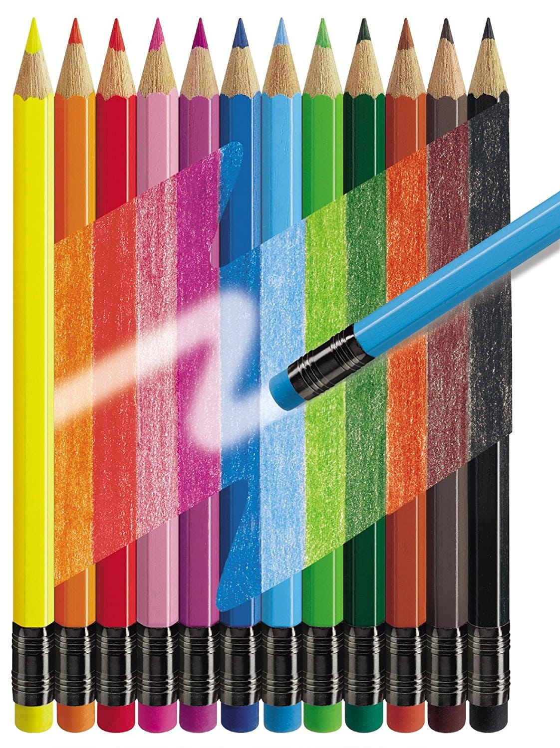 12 sześciokątnych kredek ołówkowych w intensywnych kolorach. Każda kredka posiada gumkę do mazania. Specjalna technologia klejenia SV ogranicza łamanie grafitu nawet podczas upadku.