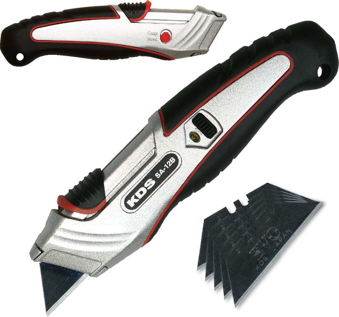 - W zestawie 1 nóż SA-12B z ostrzem trapezowym oraz 5 ostrzami zapasowymi