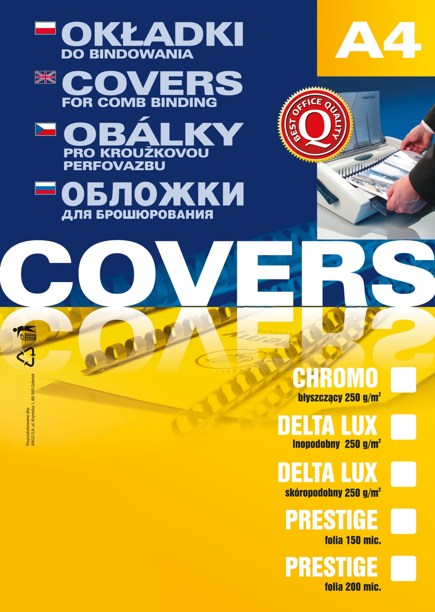 - Stosuj eleganckie okładki z przezroczystej folii ARGO jako okładkę przednią, gdy chcesz aby treść pierwszej strony była widoczna. Wyglądają elegancko i są bardzo trwałe. Twój dokument w połączeniu z okładką tylną, grzbietem lub listwą wsuwaną będzie wyglądał w pełni profesjonalnie.