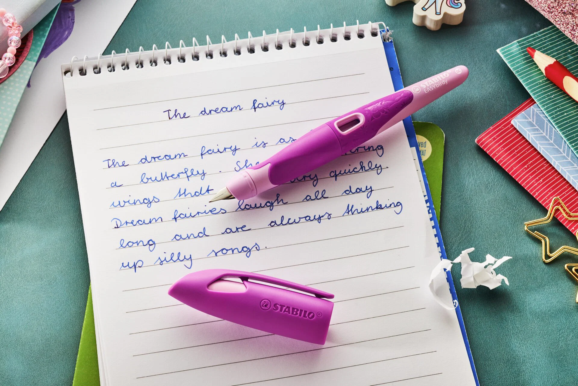 Różowa wersja z motywem wróżek i jednorożców przyciąga uwagę i sprawia, że codzienne pisanie staje się przyjemniejsze.