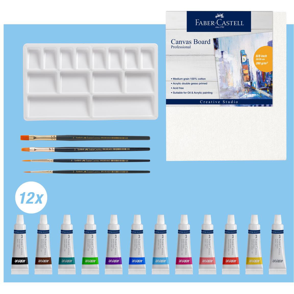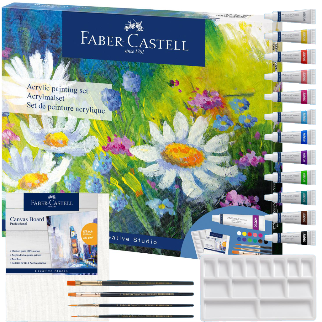 Odkryj twórczy potencjał z Zestawem Do Malowania Akrylami z serii Creative Studio od renomowanej marki Faber-Castell. Ten kompaktowy zestaw jest idealnym wyborem zarówno dla początkujących artystów, jak i doświadczonych malarzy poszukujących wysokiej jakości materiałów. Farby można łatwo łączyć i mieszać dla stworzenia niepowtarzalnych barw. Farby można nakładać bezpośrednio z tuby, mieszać kolory ze sobą lub rozcieńczać z wodą. Wodoodporne po wyschnięciu. Dodatkowo zestaw zawiera szablon do tworzenia własnej karty kolorów.