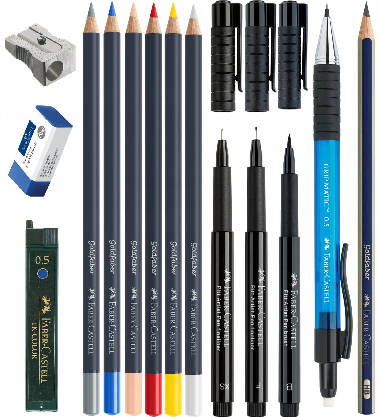 - 6 kredek Goldfaber (biała - white 101, cielista - beige red 132, żółta - cadmium yellow 107, czerwona - pale geranium lake 121, niebieska - ultramarine 120, szara - cold grey IV 233)