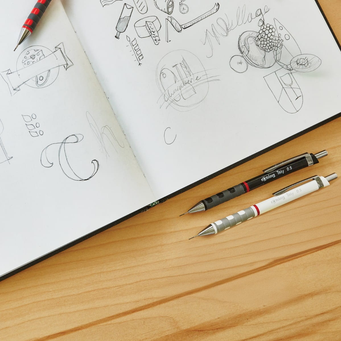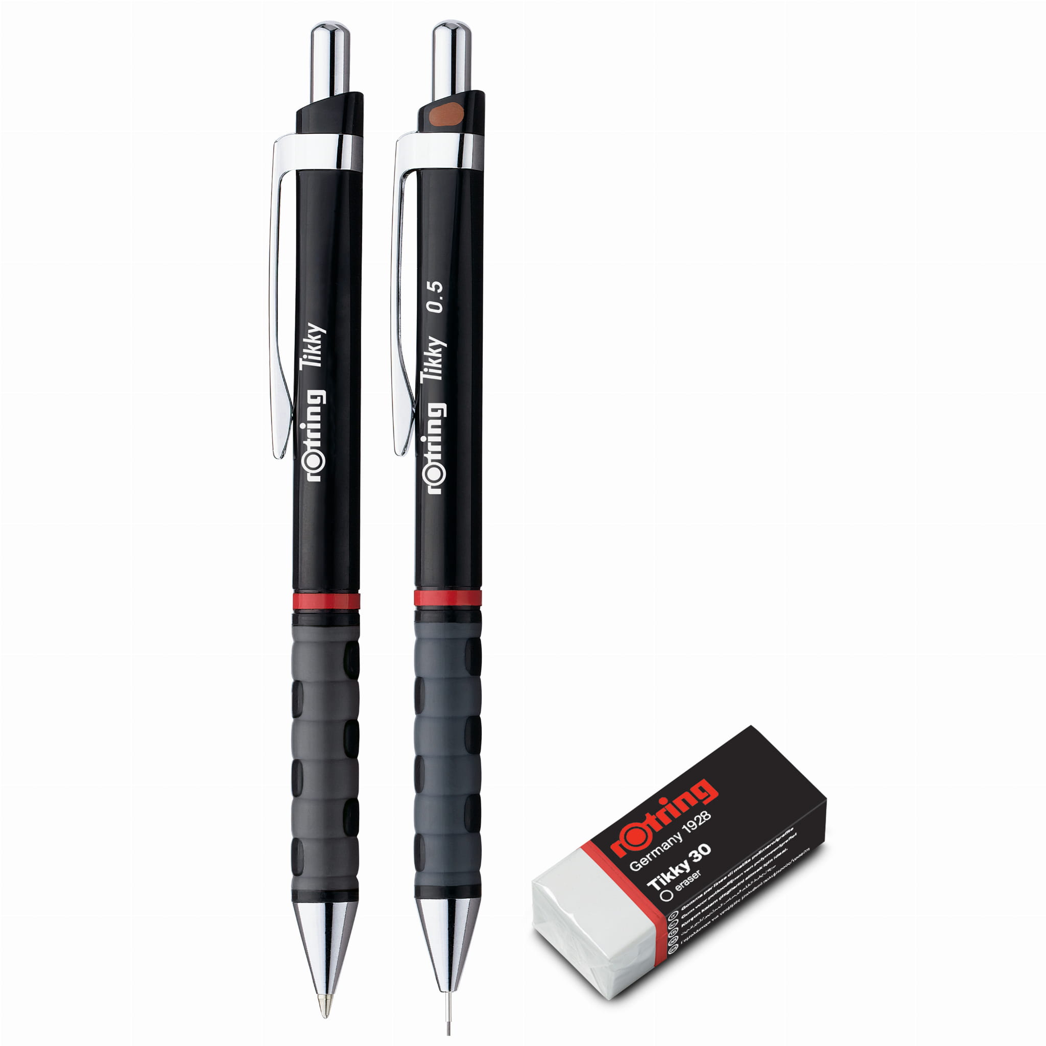 W skład kompletu wchodzi ołówek automatyczny 0,5 mm z grafitem HB, długopis z końcówką medium oraz gumka Tikky 30, która usuwa ślady grafitu bez smug.