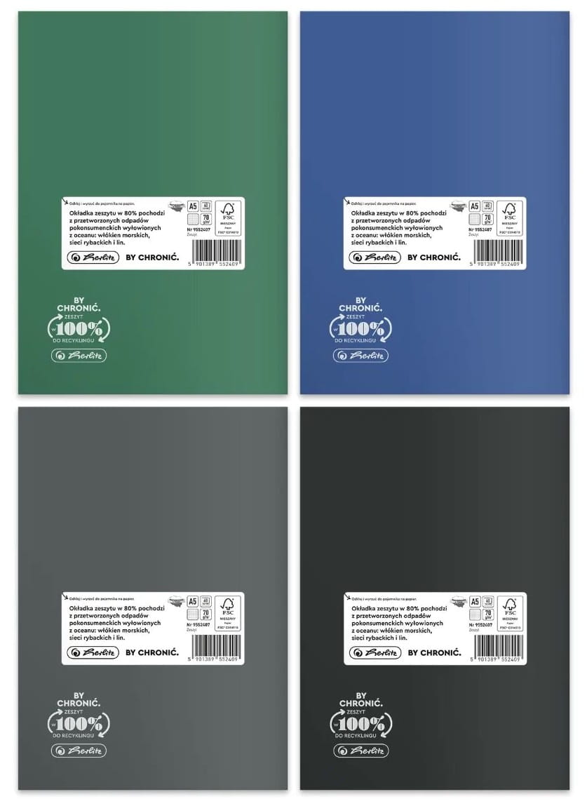 - 80% użytego surowca na okładkę pochodzi z recyclingu pokonsumenckiego a dokładniej ze śmieci zebranych z wód oceanów,